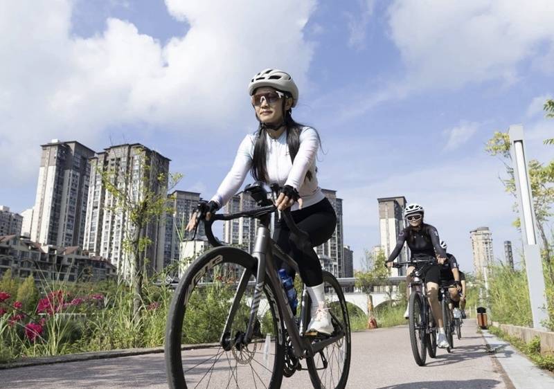 市民在玉湖公园骑行。
