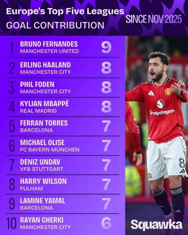 英超第16轮比赛,B费传射立功,曼联主场4比4战平伯恩茅斯。据Squawka统计,B费本年11月以来联赛参与9粒进球,五大联赛同时参与进球最多。本年11月以来五大联赛参与进球名次: